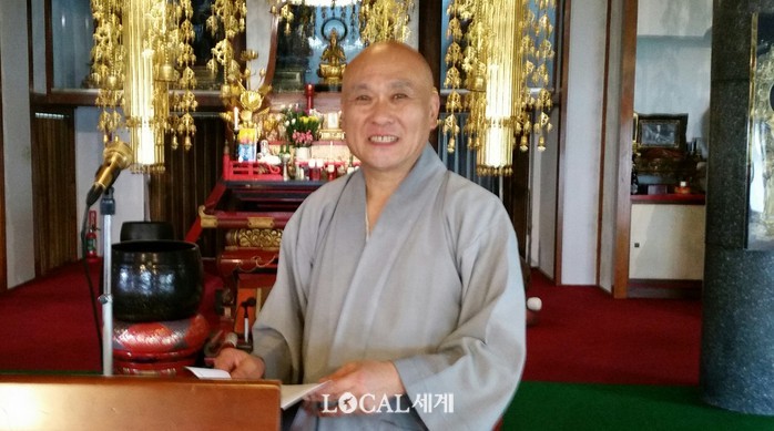 ▲ 일본 평사 윤벽암 주지가 위령제 참석자들을 반갑게 맞이하고 있다. 이승민 특파원.