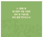 연구소는 지난 2017년 12월부터 2018년 3월까지 대통령직속 정책기획위원회가 발주한 ‘3·1운동 및 임시정부 수립 100주년 의의 및 기념사업 추진 방향’이라는 제하의 연구용역을 수행했다. 이 연구과제는 3·1운동 및 임시정부 수립 100년의 의의, 기념사업의 추진방향과 체계, 기념사업 관련 사회 분야별 활동방안, 새로운 100년을 위한 대한민국의 비전 만들기 등으로 구성되었다. <보고서>는 ‘지난 100년을 정리하고 다가올 미래 100년을 준비한다.’는 취지 아래 3·1운동과 임시정부 수립 100년을 기념하는 것을 넘어 현재 한국사회가 안고 있는 시대적 과제를 해결하기 위한 전망과 제도 개선까지 제시하고자 했다. 연구소는 이번 연구에서 3·1운동 및 임시정부 수립 100주년의 의의를 ‘시간과 공간과 정신의 확장’이라는 세 차원에서 새롭게 정리했다. 시간의 확장에서는 과거 100년, 미래 100년을 함께 고민하고, 공간의 확장에서는 3.1운동 기념을 한국만의 행사가 아닌 국제적인 행사로 확대하고, 정신의 확장에서는 3.1운동의 이념을 국내적으로는 민주공화제, 국제적으로는 ‘자기결정권’에 기초한 독립정신, 그리고 인권과 평화, 연대라는 가치를 강조했다. 이러한 방향과 이념을 현실화시키기 위해 <보고서>는 대한민국 100년 기념사업의 체계와 방법, 사업 등을 추진할 민관공동위원회의 구성과 역할을 구체적으로 제안했다. 그리고 기왕의 정부 주도 기념사업이 갖는 한계를 극복하는 한편, 촛불혁명에서 확인된 변화를 갈망하는 시민들의 바람을 담아내고자 시민참여사업을 크게 확대하도록 요구했다. 중점사업으로 독립의 언덕 조성사업, 미래비전 국민대토론회 및 연관사업, 남북공동사업, 재외동포사업, 3·1운동재현사업, 임정 청사 등 국내외 독립운동 유적지 보존사업, 대한민국 100년 사료집 편찬사업, 한국 민주주의