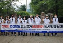 [초점] 조선일보 방씨 일가의 ‘그린벨트 훼손 불법 호화 묘지’ 규탄 집회 연구소 경기북부지부가 주도적으로 참여하고 있는 의정부시항일독립운동기념사업회(준)는 8월 8일 의정부종합운동장 엄복동 동상 앞에서 ‘친일파 조선일보 방씨 일가 불법행위범시민 규탄대회’를 열고 불법 호화묘지에 대한 행정절차에 즉각 돌입할 것을 의정부시에 요구했다. 앞서 고발뉴스는 지난해 1월부터 방씨 일가가 700여 평에 이르는 그린벨트 임야를 훼손해 호화 분묘를 불법 조성한 사실이 드러났음에도 의정부시는 후속 조치를 취하지 않고 있음을 연속 보도했다. 고발뉴스의 보도를 접한 기념사업회는 이날 집회에서 “일제강점기에는 친일, 해방 후에는 친독재를 일삼아온 조선일보 사주 방씨 일가가 수십 년 전부터 의정부시 가능동에 불법 조성한 가족묘지에 대해 관계당국은 철저한 조사를 통해 이에 상응하는 법적 조치와 원상회복을 할 것을 강력히 촉구한다”고 밝혔다. 또한 ‘의정부 관내 불법 조성된 조선일보 방응모 일가의 가족묘에 대하여 법률에 따라 엄격한 처벌과 원상복구를 위하여 청원드립니다’란 제목의 청와대 국민청원도 올려놓았다. 참가자들은 집회를 마친 후 엄복동 동상부터 가족묘가 시작되는 입구까지 행진했다. 의정부시항일독립운동기념사업회(준)는 올 가 을에 정식 창립과 동시에 조선일보를 산림법, 장묘법, 개발제한구역특별법 등 위반 혐의로 고발할 예정이다. • 방학진 기획실장