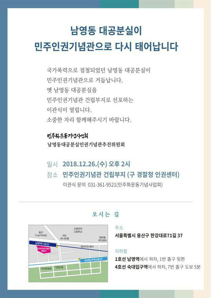 알림 [알림] 남영동 대공분실이 민주인권기념관으로 다시 태어납니다 (12.26) By 민족문제연구소 - 2018년 12월 25일 1523 NO COMMENTS 소식 알림 성명논평 보도자료 주요기사 지부활동 화보 9,975