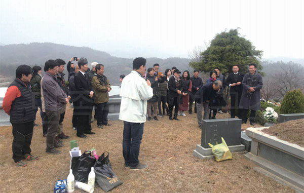 추모객 일행은 다시 천안삼거리공원으로 돌아와 버스를 타고 20분 정도 이동하여 천안공원묘지에 도착했다. 꽤 높은 곳에 위치한 곳인데도 묘소 앞까지 버스가 올라간다. 선생은 나주 임씨 가족공동묘 3기 중에 앞쪽 동생 묘와 대각선으로 뒤쪽에 자리하고 있다. 참여한 회원들은 선생의 숭고한 뜻을 한마음으로 되새기며 이민우 운영위원장을 필두로 술 한 잔, 담배 한대 올리고 추념 후 음복을 했다. 그리고 다 같이 우렁차게 ‘임을 위한 행진곡’을 합창하고 하산하러 버스로 향했다.