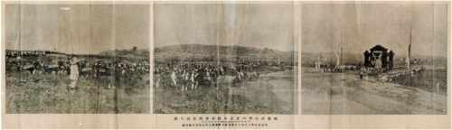그런데 이 와중에 <도쿄아사히신문(東京朝日新聞)>은 드물게도 1894년 8월 28일자의 부록으로 ‘명치 27년(1894년) 8월 5일 아병경성개선지도(我兵京城凱旋之圖)’라는 제목을 붙여 3매 연속 사진을 파노라마 형태로 담아낸 인쇄물을 배포하였다. 이미 20여 일 전의 상황이긴 하지만 생생한 전투소식을 알리는 나름의 전쟁 속보였던 셈이다.