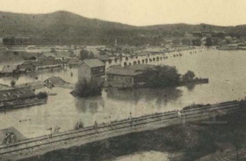1925년 을축대홍수 당시 경정(京町, 지금의 문배동) 일대의 침수상황이다. 사진촬영지점은 ‘문평산’으로 표시되어 있으며, 전면으로 남산 자락과 삼각지 일대가 포착되어 있다. (조선총독부, <조선의 홍수>, 1926)