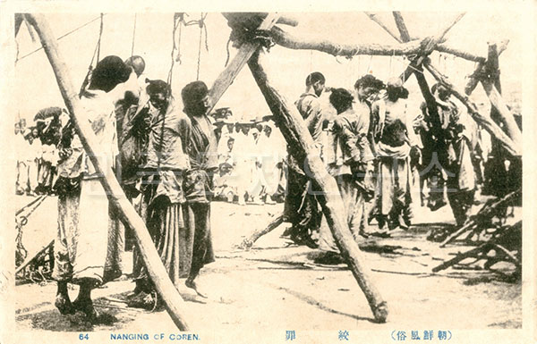여느 사람들이라면 똑바로 응시하기도 힘든 처참한 광경을 담아낸 두 장의 사진엽서가 여기에 있다. 열 명 남짓한 죄수들이 집단적으로 교수대에 걸려 최후를 맞이한 모습이 자못 섬뜩하면서도 애처로운 느낌을 자아내게 한다. 가만히 살펴보면 여러 개의 지게들이 주변 바닥에 흩어져 있는 것이 보이는데, 이는 교수형 집행을 위해 발판용 도구로 사용한 것인 듯하다.