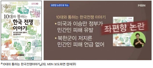 2015년 문화일보에서 우리 도서 <10대와 통하는 한국전쟁이야기>(이임하 저)에 대한 기사를 실었어요. 이 도서는 부산시 교육청이 지정한 청소년 추천도서로 선정되어 있었는데 문화일보에서 책의 좌편향이 의심된다고 보도하자 청소년 추천도서 선정이 취소되었어요. 그게 문제를 더 촉발해서 문화일보 3회, 조선일보 3회, 동아일보 2회, 중앙일보 1회, 세계일보 1회 등 일주일 동안 수십 건의 기사가 신문과 방송에 나왔습니다.