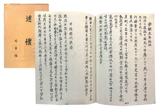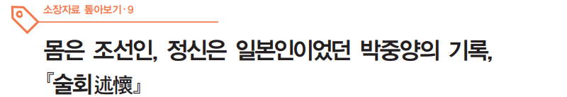 이번에 소개할 자료는 일제강점기 대표적인 친일파인 박중양(朴重陽·朴忠重陽, 1874~1959)이 해방 후인 1946년부터 1954년까지 일기 형식으로 기록한 회고록, <술회述懷>다. 일제강점기 자신의 회고담과 시국에 대한 감상 등을 335쪽에 걸쳐 작성하였는데 주로 일제의 식민통치를 찬양하고 친일행위가 구국의 길이었다고 주장하였다.