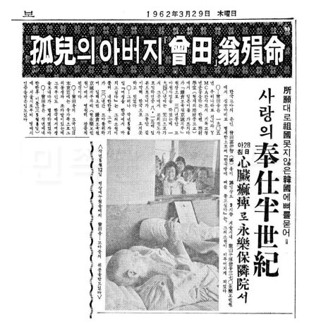 <동아일보> 1962년 3월 29일자에 수록된 소다 카이치의 사망 기사이다. 그는 전년도인 1961년 5월 7일에 입국한 지 10개월여 만에 옛 가마쿠라보육원 경성지부 자리인 영락보린원에서 숨졌다.