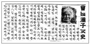 <경향신문> 1950년 1월 16일자에 수록된 소다 타키코 여사(소다 카이치의 처)의 사망기사이다.