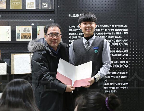 1월 7일, 담당교사 송지호(후원회원)님의 인솔 하에 18명의 동아리 학생이 식민지역사박물관에 방문하였다. 동아리 및 기부프로젝트에 대한 소개를 듣고 모든 학생에게 기부증서와 기념 선물을 증정하였다. 이후 상설전시관을 관람하며 일제시기와 해방 이후 역사에 대해 공부하는 시간을 가졌다. 기억과 성찰의 역사행동에 함께해준 소은지, 오혜빈, 유지나, 이서연, 정윤서, 안형민, 이유찬, 허정인, 김성욱, 배승연, 서화진, 장우혁, 김정호, 황서연, 황석우, 김민성, 한솔비, 김가연 님께 다시 한 번 감사의 인사를 드린다.