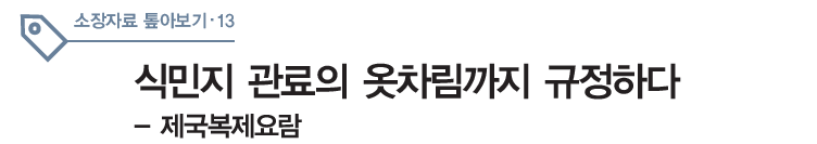 이번에 소개할 자료는 조선총독부 관리의 복식을 살펴볼 수 있는 <제국복제요람帝國服制要覽>(이하 요람)이다. 요람은 일본이 조선을 강제 병합한 바로 다음해인 1911년(명치 44년) 1월 1일, 일본의 오사카매일신문大阪每日新聞 부록(제9828호)으로 발행되었다. 조선총독부 및 소속관서직원 복제는 1911년 6월 23일(칙령 제176호)에 제정되었기 때문에 요람은 조선총독부복제는 통감부 시절의 복제를 그대로 따라한 것[襲用]이라고 해설하고 있다.