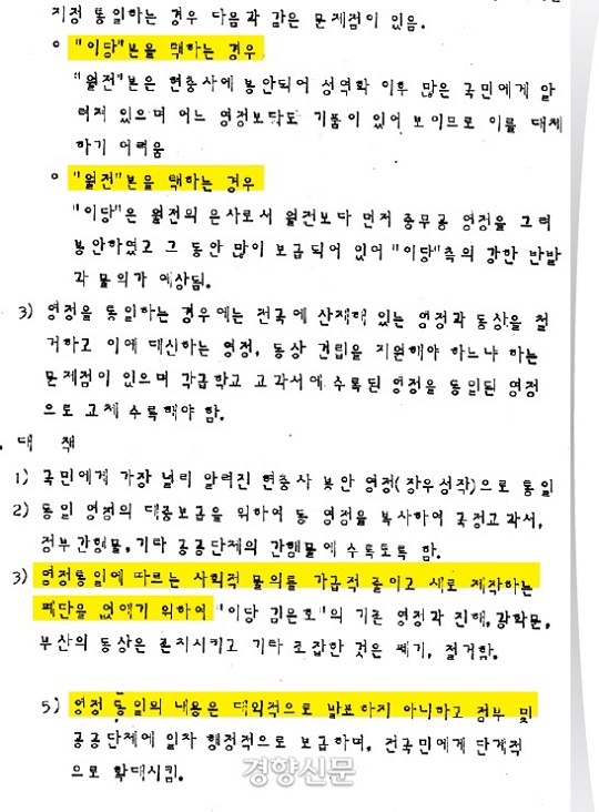 표준영정 지정 작업은 1973년 당시 박정희 대통령의 지시에 따라 이뤄진 것으로 드러났다. 문공부의 1973년 5월 2일 ‘충무공 영정 통일’ 기안 자료에 따르면 영정 통일 사업이란 타자 글자 앞에 “대통령 각하의 지시에 따른”이라는 손글씨가 적혀 있다. 이 문서는 사업 추진 경위를 일자별로 요약해 타자로 쳤다. 마지막 부분에는 “1973년 4월 28일 충무공 영정 및 동상 통일 문제 연구를 대통령 각하께서 지시”했다고 손글씨로 덧붙여 놓았다.