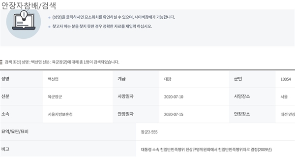 국립현충원 누리집에 수록된 ‘안장자 참배’란에는 지난 15일 안장된 고 백선엽 육군대장에 대해 ‘대통령 산하 친일반민족행위진상규명위원회에서 친일반민족행위자로 결정된 자’라는 정보를 기재했다.