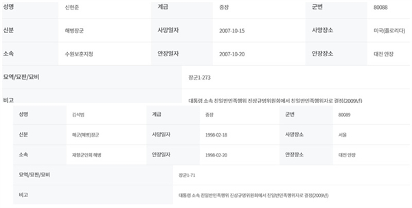 이는 지난 2018년 국정감사에서 지적을 받고 뒤 늦게 관련 정보를 수록한 것이다. 백선엽과 같이 간도특설대 등에 몸 담아 ‘친일반민족행위자로 결정된 김백일, 김석범, 김홍준, 백홍석, 신응균, 신태영, 신현준, 송석하, 이응준, 이종찬 등의 안장자 참배 정보에도 이 같은 내용이 수록돼 있다.