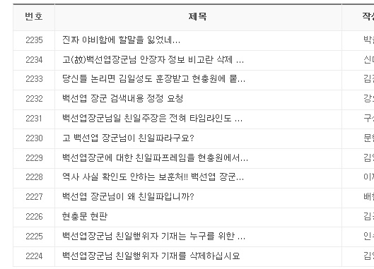 이들은 독립군을 토벌한 만주국 간도특설대 또는 일본군 간부 등으로 복무했다. 그런데 대전 국립현중원 자유게시판은 지난 17일 오후 부터 ‘백선엽 장군에 대한 친일반민족행위자 정보 삭제’ 요구들이 줄을 잇고 있다. 18일 오전 현재 30여건에 이른다.
