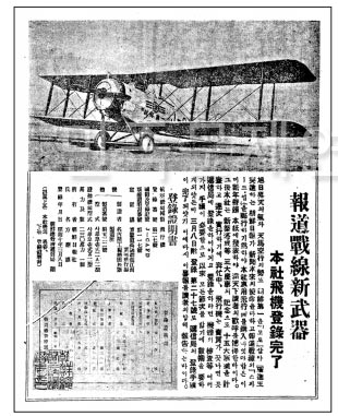 아니, 난데없이 웬 옥상 위의 비행기란 말인가? 알고 보니 이 비행기의 정체는 1935년에 구입한 조선일보 전용 비행기였다. 이에 관해서는 우선 <조선일보> 1935년 1월 1일자에 여의도 조선비행학교 신용욱(愼鏞頊) 비행사의 감독 아래 기체(機體)의 조성(造成)이 완료되었다는 소식과 함께 비행기의 사진이 수록된 바 있다. 여기에는 230마력 복엽비행기(複葉飛行機) 2인승인 이 비행기가 “신문 및 원고의 수송, 사진촬영, 통신원의 출동” 등 통신용으로 구입된 사실도 함께 서술되어 있다.
