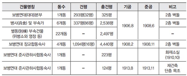 1908년 보병영 완공 당시의 병사 및 부속건물 구성 내역