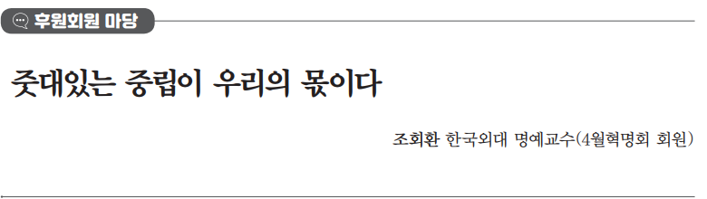 ‘근본이 서야 길이 생긴다’(本立道生)는 옛 성인의 말씀을 빌릴 필요가 없이, 우리가 피동적으로 남에게 끌려가거나 의탁하지 않고, 줏대 있게 사는 것은 우리의 당당한 고유권한이다.