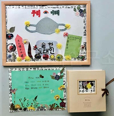 ‘뿌리와 미래’ 액자 작품과 시조는 2019년에 만들고 남았던 천으로 제작했습니다. 2019년 작품을 내일을여는역사재단에 기증했는데, 이번에도 같은 재단에 기증합니다. 그리고 2020 상반기에 연구소가 보내온 마스크는 제가 만든 마른꽃 엽서 작품과 함께 2019년 무후선열 추모작품을 만들 때 옷감을 기증해준 여러분들에게 보냈습니다. 그 사진을 설명과 함께 보냅니다. 건강하시길 기원합니다.