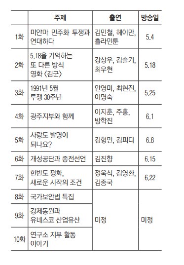 1편에서는 ‘행동하는 미얀마청년연대’ 공동대표들을 초대해 미얀마 민주화 투쟁을 위한 연대의 방송을 하였고 2편에서는 다큐멘터리<김군>의 강상우 감독을 초대해 5.18를 기억하는 다양한 방식에 대해 이야기를 나눴다. 향후 30주년을 맞이한 1991년 5월 투쟁, 광주지부 활동이야기, 대중적 역사글쓰기로 유명한 김형민 PD의 새책이야기, 김진향 개성공단 이사장의 개성공단과 종전선언, 정욱식 평화네트워크 대표의 한반도 평화 새로운 시작의 조건, 국가보안법, 강제동원과 유네스코 산업유산 이야기 등이 준비되어 있다. 연구소 30년사이야기는 하반기 백서 발간에 맞춰 방송할 예정이다.