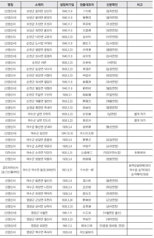 다. 하지만 여기에는 아쉽게도 세부 목록 없이 조선신궁(朝鮮神宮)과 부여신궁(扶餘神宮)을 포함하여 조선 전체의 각종 신사(神社)와 신사(神祠)를 합쳐 모두 1,141개소(1945년 6월말 현재)가 존재했다는 집계표만을 제시하고 있다.