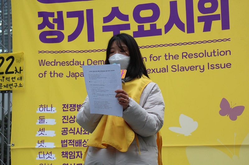 ▲ 1522차 수요시위 사회를 맡은 김영환 대외협력실장▲ 이번 1522차 수요시위는 민족문제연구소가 주관하여 진행하였다. 수요시위가 열리는 길 건너편 역사부정론자들이 반대시위를 준비하고 있다.▲ 민족문제연구소는 수요시위를 방해하는 역사부정론자들에게 스스로 양심에 비춰보라고 양심거울을 준비했다. 이 날 양심거울에 대한 관심이 컸다.▲ 수요시위를 방해하는 건너편을 비추고 있는 양심거울▲ 양심거울을 들고 있는 민족문제연구소 상근자들▲ 여는 노래 <바위처럼>을 준비한 진보대학생넷을 소개하는 김영환 대외협력실장▲ 민족문제연구소 상근자들도 무대 앞에서 노래 <바위처럼>에 맞춰 율동을 했다.▲ 진보대학생넷의 송연경 활동가가 발언하고 있다.▲ 비가 와 땅이 젖었음에도 불구하고 수요시위에 참여해준 시민들▲ 사죄하고 배상하라! 구호를 외치는 수요시위 참석자들▲ 주관단체 인사말을 하고 있는 민족문제연구소 방학진 기획실장▲ 수요시위를 방해하려고 스피커를 수요시위 방향으로 돌리는 역사부정론자들▲ 수요시위를 방해하는 엄마부대 주옥순 대표▲ 성명서를 낭독하고 있는 민족문제연구소 김슬기 학예실 연구원▲ 1522차 수요시위를 마무리하는 민족문제연구소 김영환 대외협력실장▲ 1522차 수요시위에 참여한 민족문제연구소 상근자들과 정의기억연대 이나영 이사장이 단체사진을 찍었다.