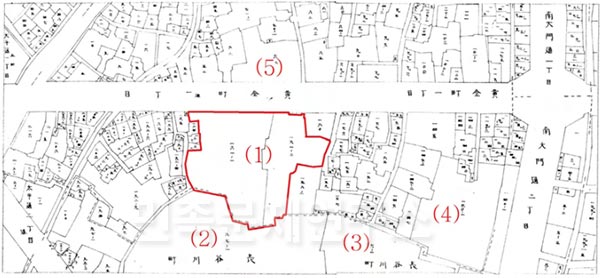 <경성부일필매지형명세도>(1929)를 통해 옛 곤당골 일대의 주요 공간 배치 상황을 살펴보면, 각각 (1)은 아서원과 반도호텔이 들어서는 ‘황금정 1정목 181번지’ 구역, (2)는 원구단 황궁우(조선호텔 구내), (3)은 석고단(총독부도서관) 구역, (4)는 조선식산은행 본점, (5)는 미츠이물산 경성지점 자리이다.