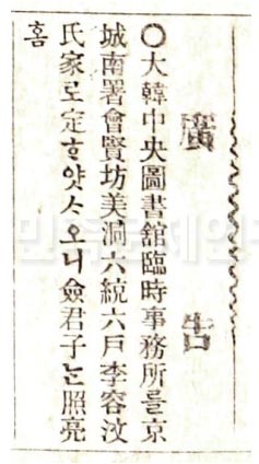 [광고(廣告)] 대한중앙도서관 임시사무소(大韓中央圖書館 臨時事務所)를 경성 남서 회현방 미동 6통 6호(京城 南署 會賢坊 美洞 六統 六戶) 이용문 씨가(李容汶氏家)로 정(定)하였사오니 첨군자(僉君子)는 조량(照亮)함.