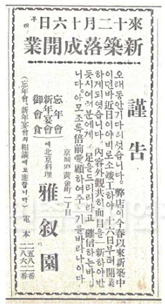 <매일신보> 1936년 12월 12일자에 수록된 북경요리 아서원의 신축낙성 재개업 광고이다. 이 당시 ‘황금정 1정목 181번지’ 일대를 차지한 노구치 재벌의 조선빌딩 즉, 반도호텔 신축공사와 관련하여 부지문제가 충돌되어 아서원은 원래의 자리에서 비껴나 새로 건물을 지어야 했던 상황이었다.