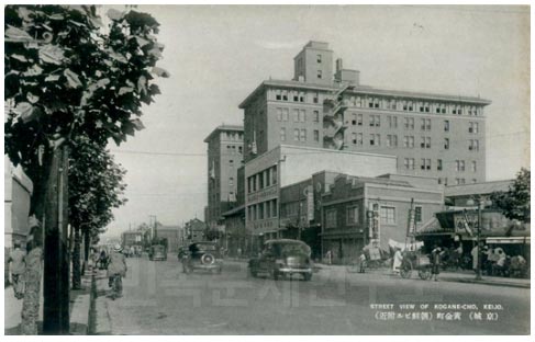 ‘황금정 1정목 181번지’ 일대에 들어선 조선빌딩(朝鮮ビル)의 전경을 담은 사진엽서이다. 조선빌딩의 상층부에 반도호텔이 들어있으므로, 조선빌딩은 곧 반도호텔과 동일한 표현인 셈이다. (민족문제연구소 소장자료)