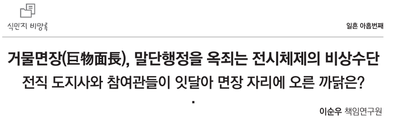 그런데 일제강점기의 면(面)과 면장(面長)에 관한 제도의 흔적을 따라가다 보면, 그 말미에 이르러 단연 두드러지게 포착되는 것은 이른바 ‘거물면장(巨物面長)’의 존재이다. 이와 관련한 직접적인 내용은 <매일신보> 1943년 3월 27일자에 수록된 「면장(面長)의 지위(地位)를 중요시(重要視), 제일선 행정(第一線 行政)을 쇄신(刷新), ‘거물면장(巨物面長)’을 전선(全鮮)에 배치(配置)」 제하의 기사를 통해 확인할 수 있다