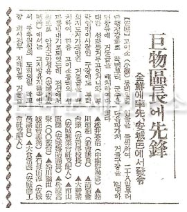 이러한 와중에 일제의 패망기로 접어들게 되자 이번에는 ‘거물구장(巨物區長)’의 개념까지 등장하게 된다. <매일신보> 1944년 5월 24일자에 수록된 「부락(部落)의 지도자(指導者)로 구장(區長)에 거물(巨物)을 배치(配置), 말단행정강화(末端行政强化)의 신포진(新布陣)」 제하의 기사는 그 배경을 이렇게 설명하고 있다.