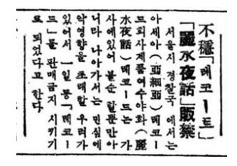남인수의 곡 <여수야화>가 판매금지되었음을 알리는 <경향신문>(1949.9.3.) 기사. 기사는 <여수야화>가 “가사에 있어 불순할 뿐만 아니라 나아가서는 민심에 악영향을 초래할 우려가 있어서” 판매를 금