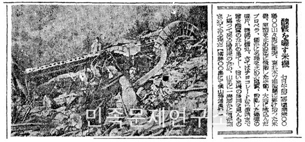 <경성일보> 1945년 8월 11일자에 수록된 ‘남해 망운산 기슭에 추락한 미군 비행기의 잔해’ 사진과 관련보도이다. 이처럼 일제의 패망시점에 이를수록 식민지 조선에도 미군기의 실제 공습 사례가 점차 가시화하고 있었던 것이다.