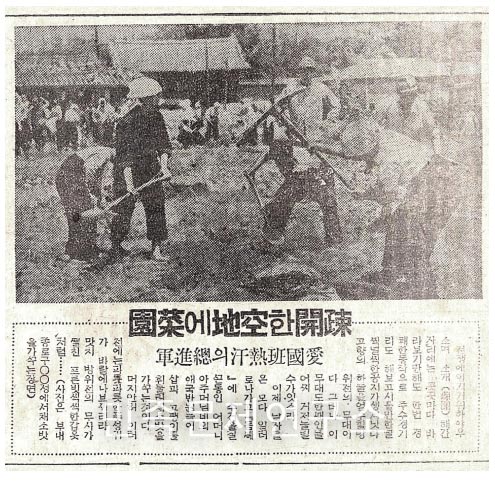 <매일신보> 1945년 6월 8일자에는 글자 그대로 ‘공터’로 변한 소개공지가 엉뚱하게도 애국반원들에 의해 푸성귀를 가꾸는 이른바 ‘일평농원(一坪農園)’으로 탈바꿈되고 있는 장면이 소개되어 있다. 뒤에 보이는 대문의 모습으로 보아 이곳은 종묘(宗廟)의 바로 앞쪽인 듯하다.