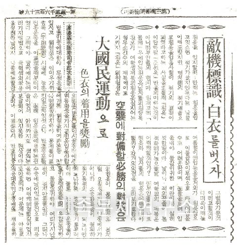 적기(敵機, 미군기)의 표적이 되기 쉬우므로 백의(白衣)를 벗을 것을 강조하는 내용이 담긴 <매일신