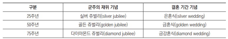 그리고 특히 군주제 국가의 경우 국왕(또는 황제)의 재위(在位) 기간을 25주년 단위로 기념하여 이를 ‘실버 쥬벌리(silver jubilee)’와 ‘골든 쥬벌리(golden jubilee)’로 일컫는 것 역시 이 범주에 속하는 개념들이다. 결혼 몇 주년 기념을 나타내는 것으로 곧잘 사용되는 은혼식(銀婚式), 금혼식(金婚式), 금강혼식(金剛婚式)도 이러한 용법의 연장선상에서 나온 말이다. 그런데 여기에다 회혼식(回婚式, 60주년)이라는 말 또한 보편적으로 통용되고 있으니 그야말로 동서양의 관념이 마구 혼재되어 있는 상황이 아닌가 싶다.