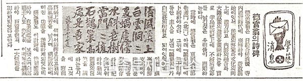 <매일신보> 1940년 4월 17일자에 수록된 토쿠토미 소호(德富蘇峰)의 시비 건립 관련 기사이다. 그가 경성에 머물 때에 거처로 삼았던 삼청동 백운장 구내의 작소거(鵲巢居) 바위면에 새긴 칠언절구의 말미에는 ‘소봉 77세 늙은이’라고하여 그 자신의 ‘희수(喜壽)’를 기념하여 이를 적은 뜻이 또렷이 담겨 있다.