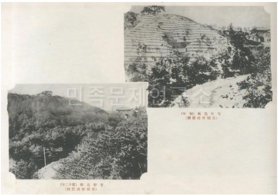 조선총독부에서 발행한 <사진첩조선>에 삽입된 사방조림지 비교 사진. ‘조선총독부 시정1주년기념엽서’, <애뉴얼리포트>등 일제가 선전하는 홍보물에 자주 등장하는 사진으로 창의문 안에 있던 백운동(白雲洞)의 식림사업 초창기와 10여 년 후의