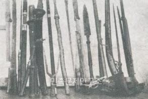 ‘폭도들이 사용한 병기’로 기재된 의병들의 무기다. 다양한 계층으로 구성된 의병들은 화승총, 칼, 농기구 등 열악한 병기를 가지고 신식무기로 무장한 일본군들과 맞서 싸웠다.