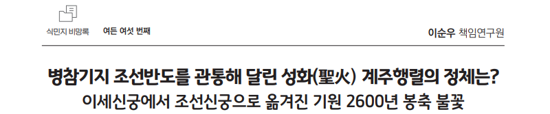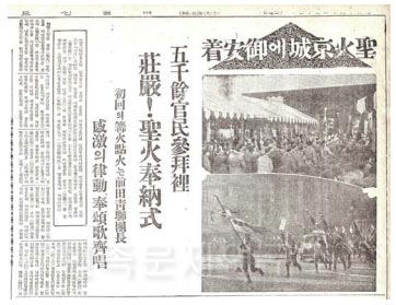 그런데 이러한 성화(聖火)라는 단어가 올림픽과는 전혀 무관하게 여러 날에 거쳐 온통 신문지면을 장식하던 시절도 있었다. 예를 들어, 『매일신보』 1940년 2월 2일자에 수록된 「반도발전(半島發展)을 기원(祈願), 화찬구(火鑽具) 성화(聖火)를 배수(拜受), 3일 부산(釜山)을 출발(出發)」 제하의 기사에는 이러한 내용이 들어 있다.