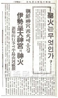 『매일신보』 1940년 2월 9일자에 수록된 「성화(聖火)는 무엇인가? 조선신궁(朝鮮神宮) 구화(篝火)에 옮길 이세황대신궁(伊勢皇大神宮)의 신화(神火), 획기적 행사(劃期的 行事)에 반도산하 감격(半島山河 感激)」 제하의 기사는 신궁에서 불의 존재를 신성하게 여기는 뜻과 구태여 이른바 ‘성화봉천(聖火奉遷)’의 행사를 벌이는 까닭을 이렇게 설명하고 있다.