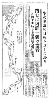 광휘 있는 황기 2600년의 축전을 앞두고 조선신궁에서는 국조황대신궁(國祖皇大神宮)으로부터 존귀한 화찬구(火鑽具, 히키리구)를 배하고 동업(同業) 경성일보(京城日報)와 조선연합청년단(朝鮮聯合靑年團)에서는 성화(聖火)를 배수하여 병참기지 반도의 비약적인 발전을 기원하기로 되었다고 함은 기보한 바어니와 배수한 화찬구와 성화는 3일 오전 7시 부산에 상륙하여 용두산신사(龍頭山神社)에서 구화(篝火, 카가리비)에 점화하여 가지고 정선수(正選手) 2명에게 봉지되어 조선신궁까지 계주(繼走)를 할 터인데 조선신궁 도착은 9일 오후 2시라고 한다.