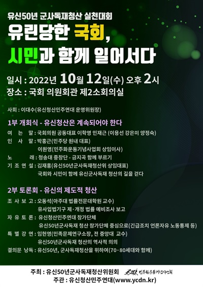 유신50년군사독재청산위원회(아래 유신50년청산위)는 12일 오후 국회 의원회관에서 유신청산 실천대회를 열고 ▲1972년 10월 유신선포 ▲1980년 5월 신군부 내란 그리고 ▲1961년 5.16 군사쿠데타 후 그 주모집단이 감행한 국회 해산은 무효라고 선언했다.