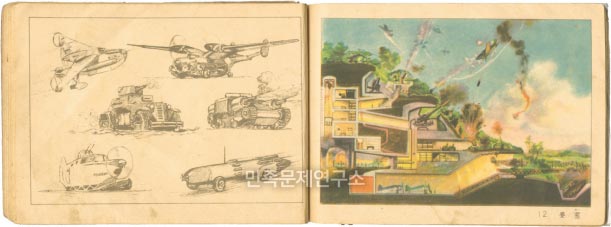 1학년 셈본 교과서로 삽화는 군복을 입은 아이들과 비행기, 탱크 등을 이용해 숫자를 익히는 교재다. 또한 모형총으로 제식훈련 중인 아이들의 수를 셈하는 모습 등이 수록되어 있다. 이는 학교가 어린아이 때 부터 예비 전사로 키우기 위해 전시 생활을 지도하고 있음을 알 수 있다.