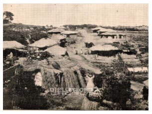 진흙과 새끼줄로 지은 집은 근대 석조 건축물과 대비하며 원시성을 강조했다.