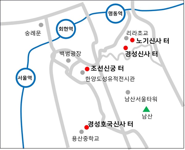 남산의 신사 탐방로 : (명동역)-경성신사 터-노기신사 터-조선신궁 터-남산서울타워-경성호국신사 터