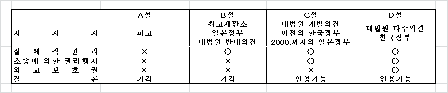 논리적으로 가능한 모든 해석이 나온 것입니다. A 설이 피고의 주장이며 ‘실체적 권리가 없으니까 기각되어야 한다.’ B 설이 일본 최고재판소 판결과 대법원 반대의견이며 ‘외교보호권만이 포기되어 실체적 권리는 남아 있지만, 재판으로 행사할 수 없게 되었기 때문 기각되어야 한다.’ C 설은 대법원 개별의견, 2000.까지의 일본정부, 대법원판결 이전의 한국정부의 의견이며 ‘청구권협정으로 외교보호권이 포기되었을 뿐이고,실체적 권리는 남아있다. 재판에 의한 권리행사도 할 수 있다. 그래서 법원의 판단으로 청구를 인용(認容)할 수 있다 ‘라는 것입니다. 그리고 D 설이 대법원 다수 의견, 지금의 한국정부 견해이며 ‘이 문제는 청구권협정의 대상이 아니어서 외교보호권도 포기하지 않고 있다. 실체적 권리도 있고 재판에 의한 권리행사도 할 수 있다. 그래서 청구를 인용해도 된다’라는 것이입니다.