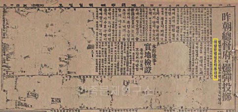 백주대낮에 벌어진 조선총독부 폭탄투척 사건으로 총독부는 큰 혼란에 빠졌다. 그 증거가 당시의 언론에 고스란히 남아 있다. 보도 통제가 제대로 되지 않아 사건 당일 <동아일보>는 호외까지 발행해 사건 소식을 알렸고, 다음날 조간에는 주요 신문들이 모두 현장 사진과 함께 사건을 대서특필했던 것이다. 더 가관인 건 그들의 기관지 ????매일신보????다. ????매일신보????는 총독부가 공개하고 싶지 않은 정보까지 너무 자세하게 쓰는 바람에 급히 기사를 긁어내야 했다. 그런데 너무 급하게 긁어내다 보니 범인을 특정하는데 필요한 중요 정보가 그대로 공개되고 말았다. 제목 말미에 남은 “아부나이”가 바로 그것이다.