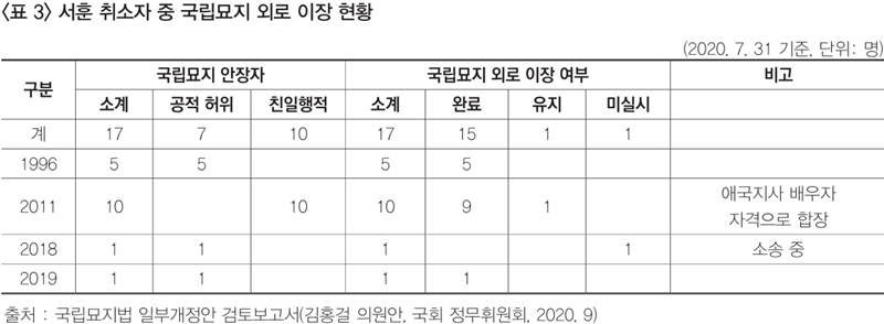 “개정안에 대하여 국가보훈처는 친일반민족행위와 함께 광복 이후 국가에 기여한 공로 등을 종합적으로 고려하여 결정할 사안이며, 이미 안장된 사람에 대한 강제이장은 법률불소급 원칙 및 입법상 신뢰 보호를 위해 신중한 접근이 필요하다는 입장임”(김홍걸 대표발의 국립묘지법 개정안 검토 보고서, 2020. 9).
