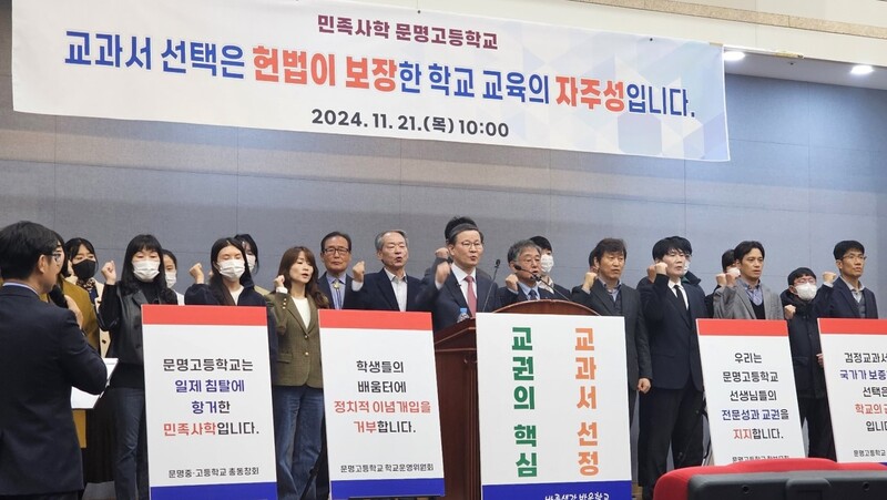 한편, 문명고는 지난 2017년 박근혜 정부 시절 전국에서 유일하게 국정 역사교과서 연구학교로 지정돼 논란이 됐다. 지난 19일 전국교직원노동조합 등으로 구성된 ‘문명고 친일독재 미화 불량 한국사 교과서 채택 대응 대책위’는 문명고 앞에서 기자회견을 열어 “친일·독재를 미화한 불량 한국사 교육 시도를 즉각 중단하라”고 요구했다.